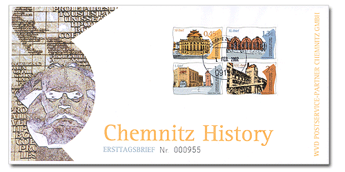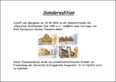 | Sonderedition DIN A5 für den Chemnitzer Briefmarken Club 1990 e.V.. Viererzusammendruck 1/2/3/4, gestempelt mit dem 15. Aug. 2002, und in Folie (matt) eingeschweißt. |