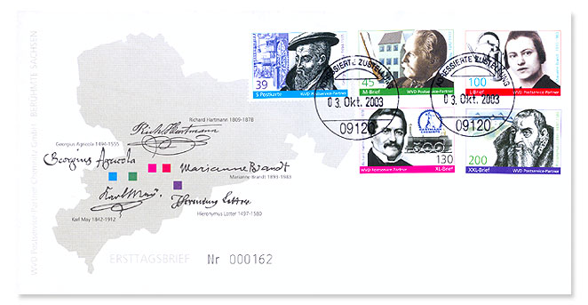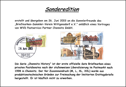 | Sonderedition DIN A5 für den Briefmarken-Sammler-Verein Wittgensdorf e.V.. Viererzusammendruck 1/2/3/4 und 5, gestempelt mit dem 26. 06. 2003, und in Folie (glänzend) eingeschweißt. |